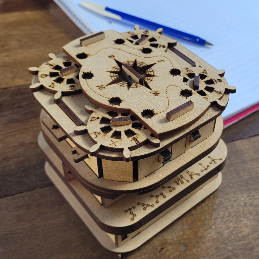 Fabricada con MDF (fibra de madera) de alta calidad, cada componente ha sido cortado y grabado con láser, asegurando detalles delicados que resaltan su diseño. Cada Escapebox es hecha a mano, lo que la convierte en un producto verdaderamente único.